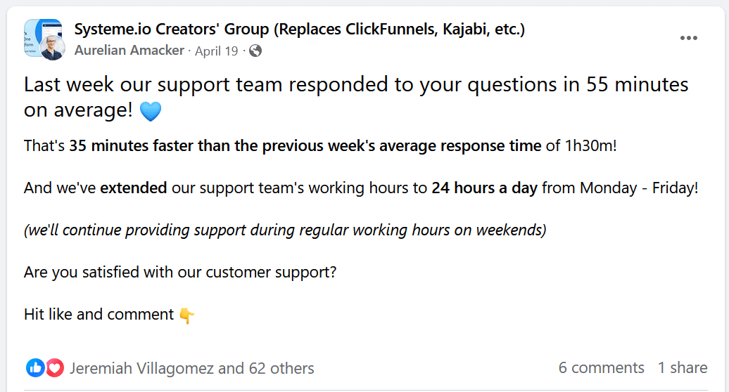 When it comes to support, Systeme.io is second to none. The founder, Aurelien Amacker, has improved the support on this platform until it has reached a point where most support tickets are answered within 2-4 hours.